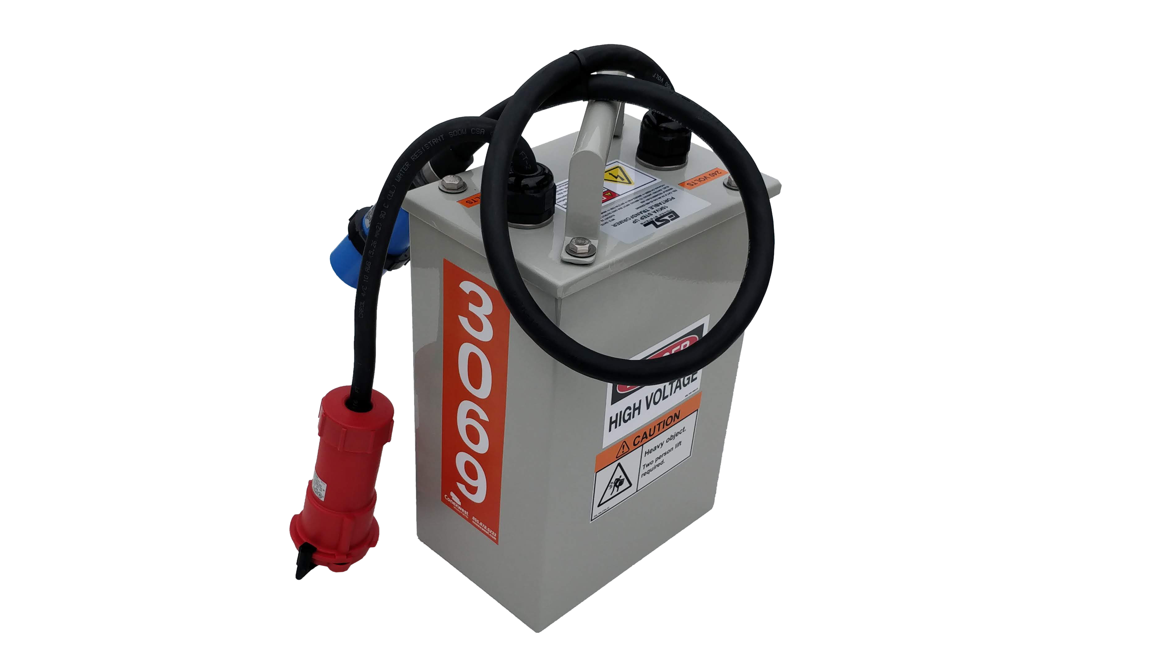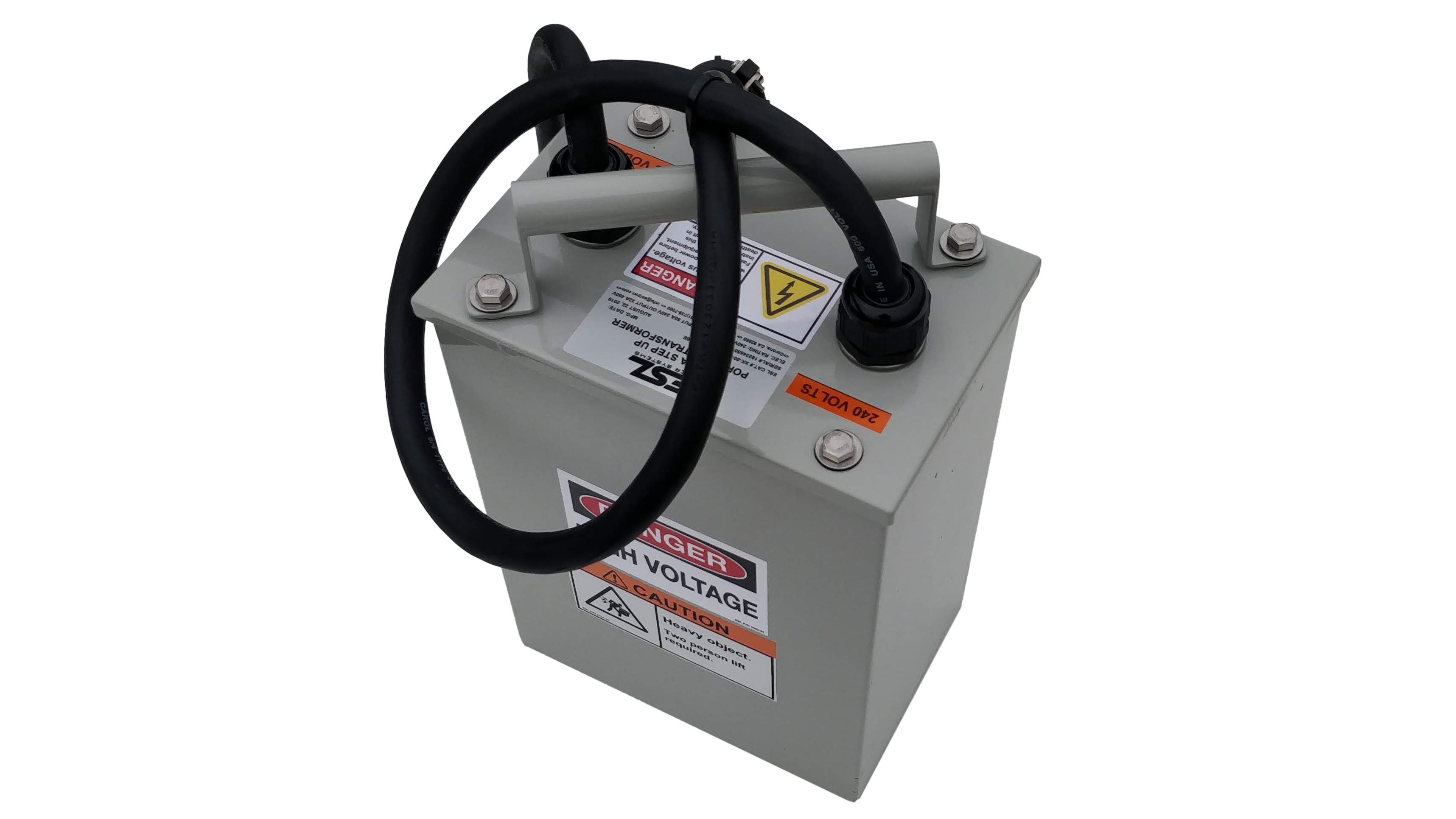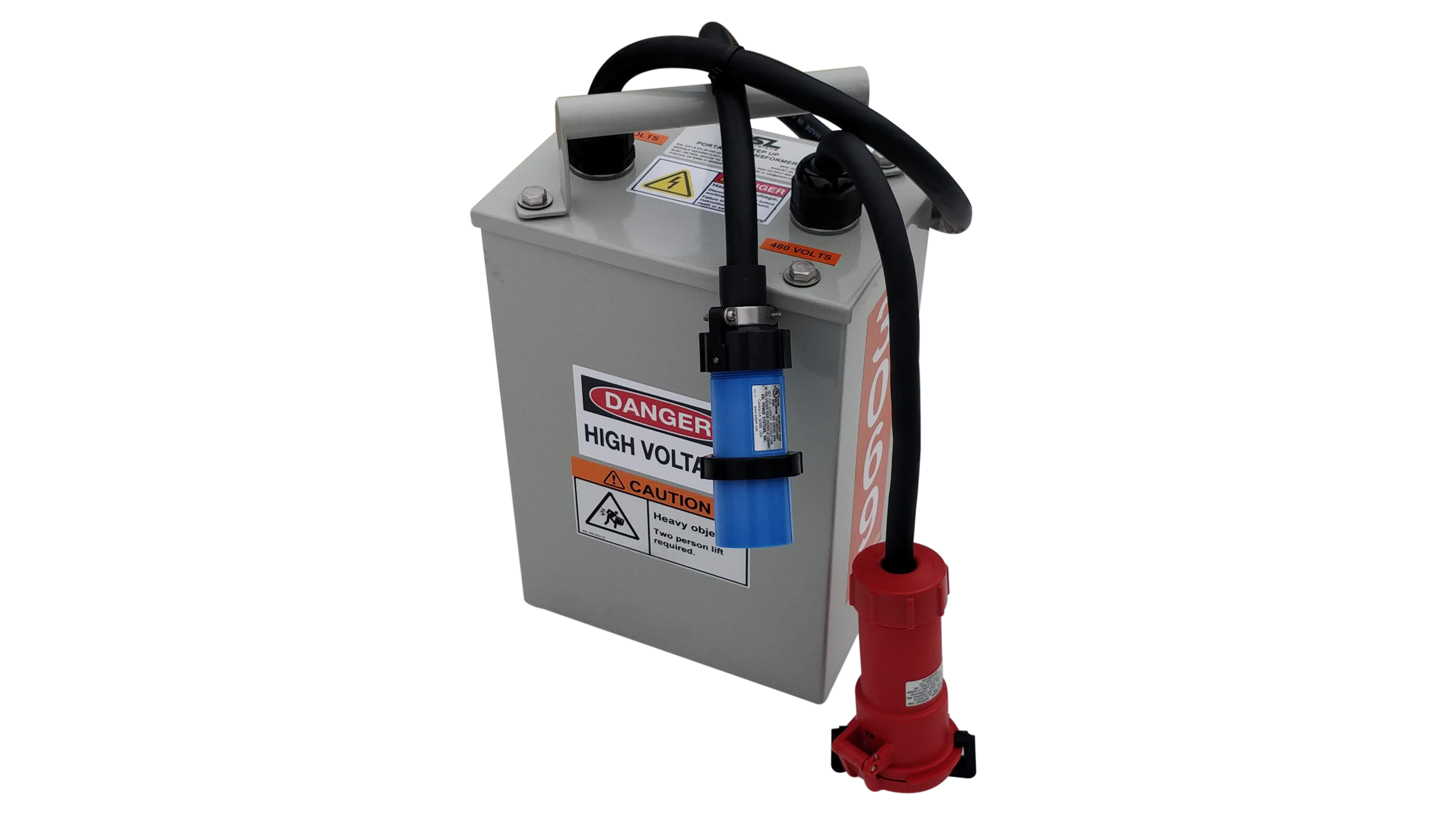 Each modular transformer includes 8/4 SO cable with black 60˚C (140˚F) rated rubber insulation. The dual-voltage transformer is mounted to a plate/bracket, with optional circuit breaker and high-voltage receptacle attached. Standard receptacle conforms to CEE-17 design.